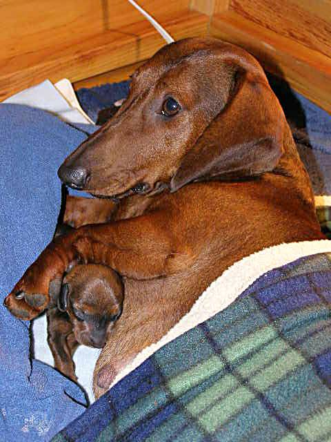 She's rooting around in her whelping box and then resting. Rooting, resting. Rooting, resting. Well, you get the idea.